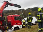 Zunächst wurde der Transporter mithilfe der Seilwinde gegen ein weiteres Abrutschen gesichert. Anschließend entschied die Einsatzleitung, das Wechselladefahrzeug mit Kran (WLF-K) der Feuerwehr Rohrbach nachzualarmieren, um eine schonende Bergung durchführen zu können. Nach dem Eintreffen der Unterstützungseinheit konnte rasch mit der Bergung begonnen werden. Während der Kran das Unfallfahrzeug anhob, wurde es gleichzeitig mit der Seilwinde zurück auf die befestigte Fahrbahn gezogen. Nach kurzer Zeit stand der Kleintransporter wieder sicher auf festem Untergrund und konnte seine Fahrt fortsetzen.