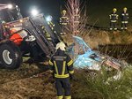 Nach der Rettung der verletzten Personen begannen wir mit der Fahrzeugbergung. Mithilfe der Seilwinde des Rüstlöschfahrzeugs Helfenberg sowie des Gemeindetraktors konnte das schwer beschädigte Fahrzeug aus dem Teich gezogen werden. Erschwert wurde die Bergung durch das Befestigen des Fahrzeugs unter Wasser sowie durch die steile Böschung des Teiches.